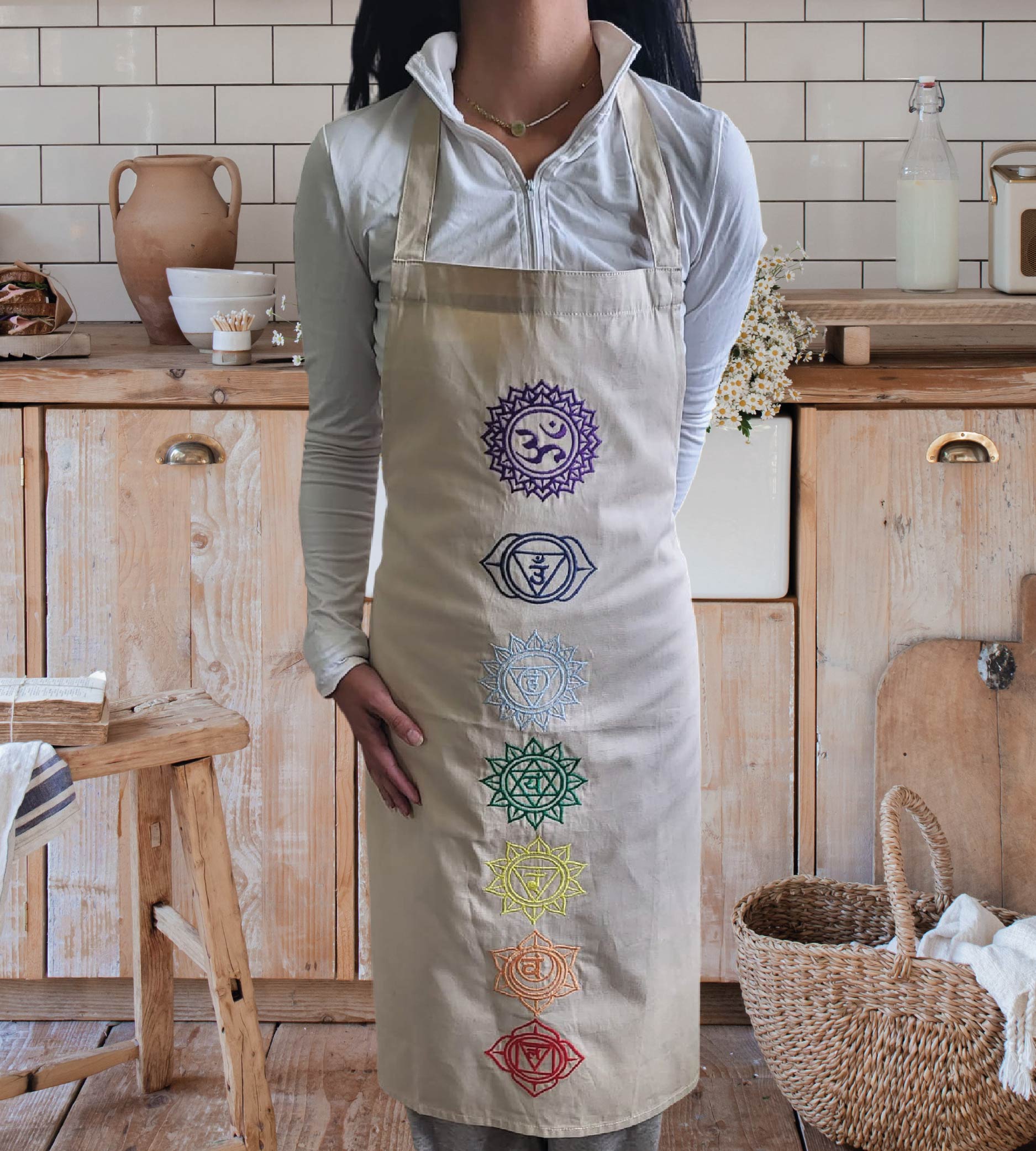 This handcrafted chakra apron is more than just a kitchen or craft essential—it’s a piece of wearable alignment. Whether you’re preparing meals, painting, or practicing mindful living, this apron brings grounding energy to your everyday rituals.