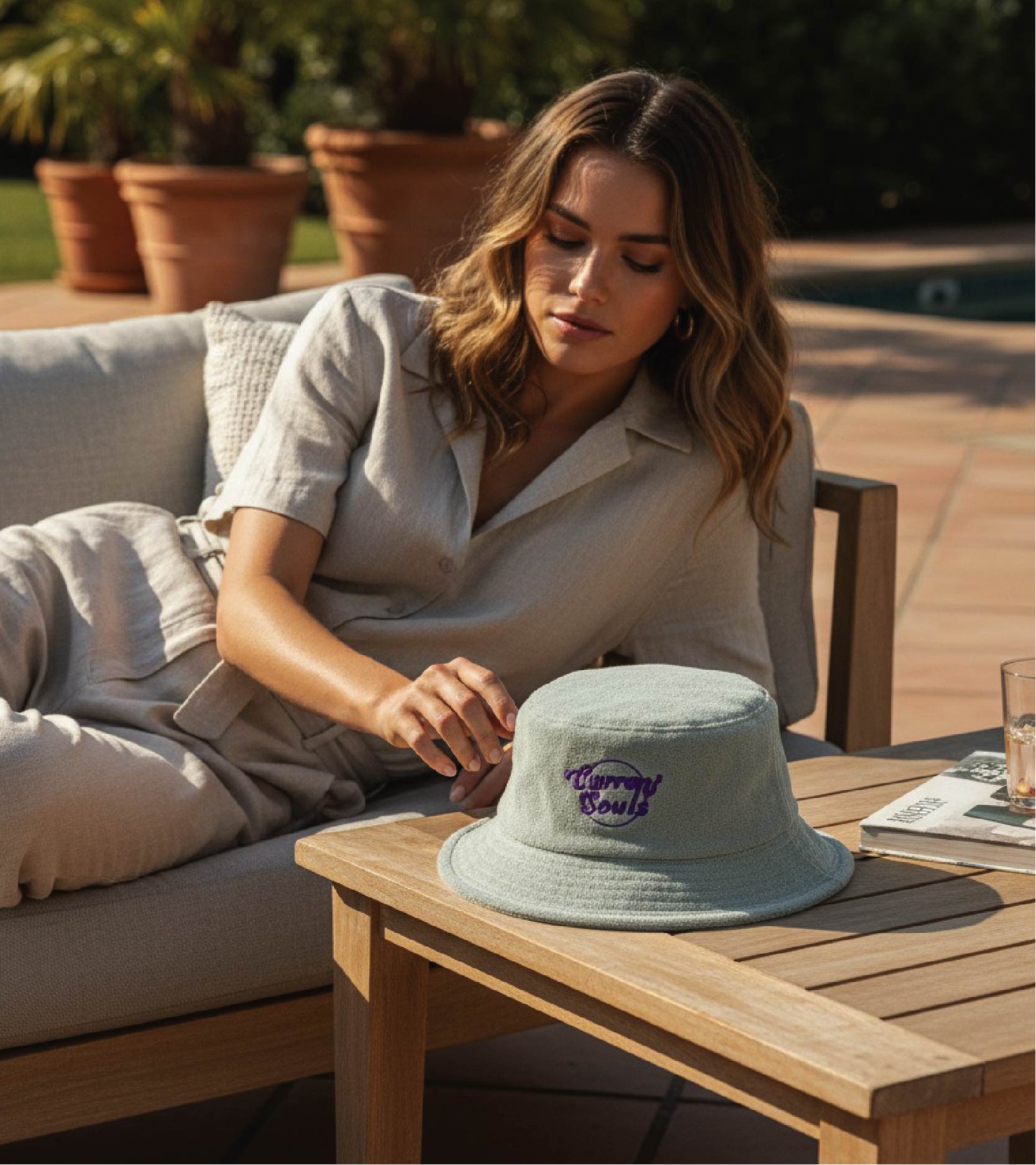 This handmade Terry toweling bucket hat is your new go-to for relaxed, conscious living. Made from 100% organic cotton, it offers breathable, absorbent comfort—perfect for beach days, festivals, and laid-back weekends.